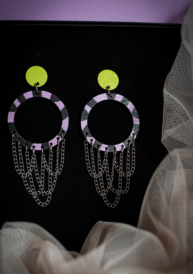 Näissä koruissa on keltaiset napit (puuta), jotka ovat tilauksen ylijäämäosia ja puurinkulat, joiden kakkoslaatuisen printtauksen peitin akryylitusseilla taiteillen. Päälle suihkautin lakkaa, jotta värit kestäisivät kulutusta.