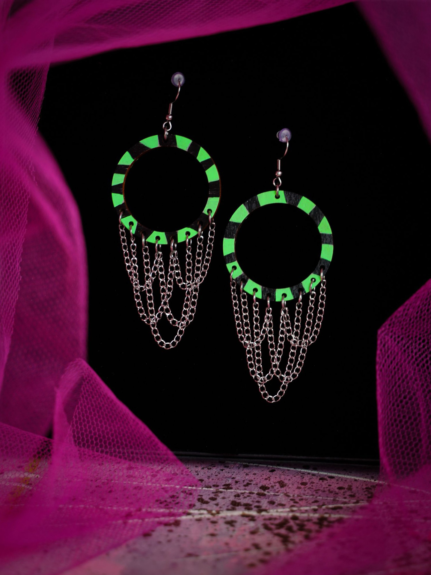 Näissä koruissa kakkoslaatuisen printtauksen (puurinkula) peitin akryylitusseilla taiteillen. Päälle suihkautin lakkaa, jotta värit kestäisivät kulutusta.