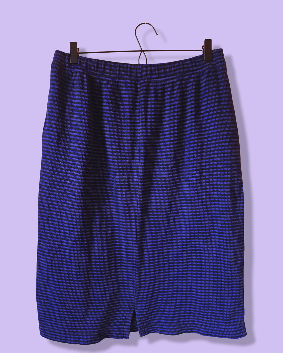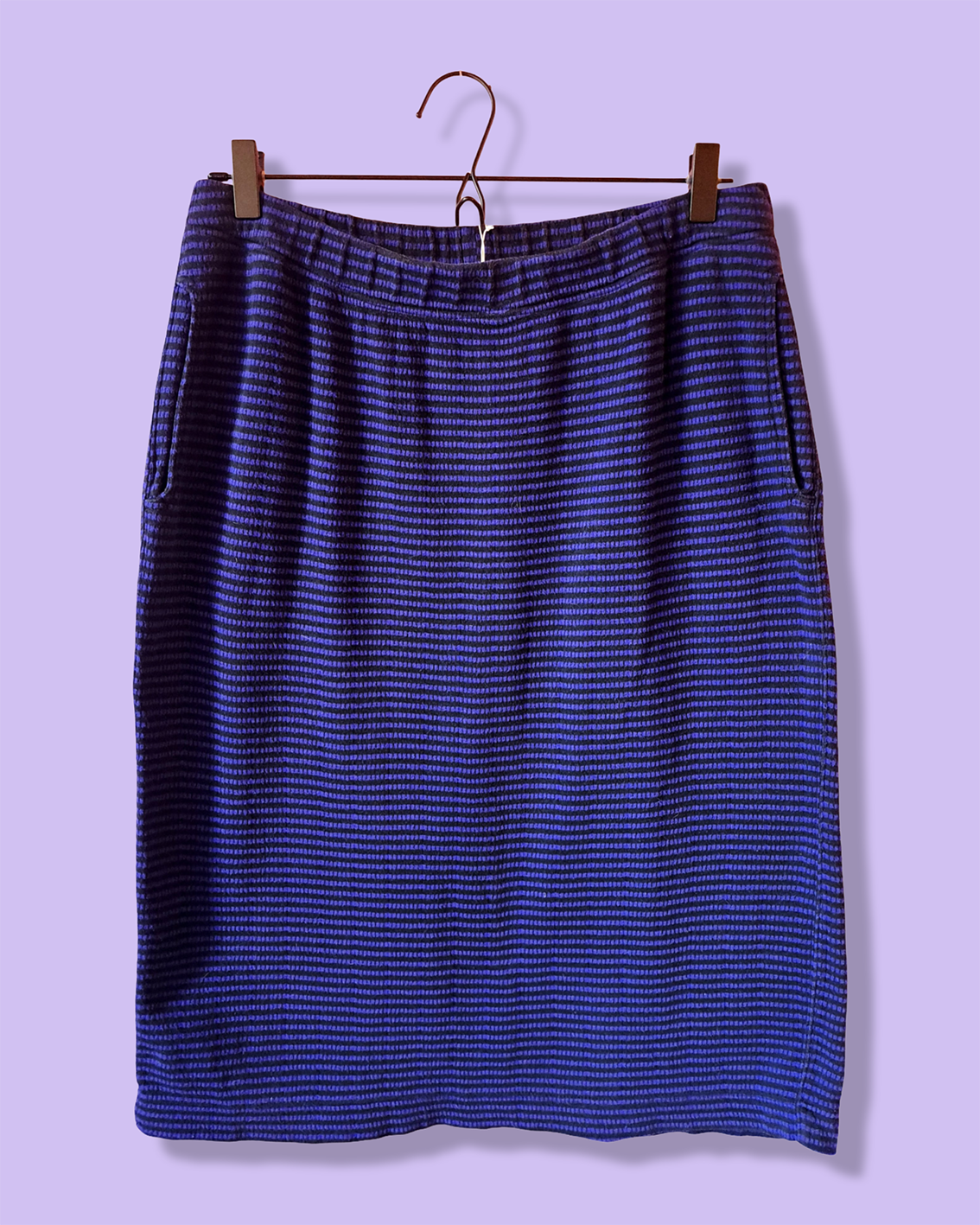 Violetti-musta-raidallinen hame. Sivuilla taskut. Takana halkio. Vyötäröllä leveähkö kuminauha.